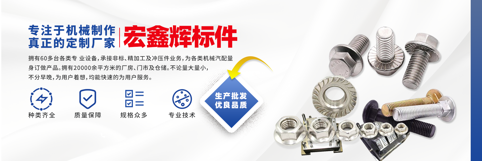 四川宏鑫輝標準件制造有限公司下設:南充市宏輝機械制造有限公司,南充市聚宏機電設備有限公司,公司始建于1994年。為了拓展市場,降低成本,本公司于2007年、2020年分別在南充、 成都、重慶創建了生產基地。擁有60多臺各類專 業設備,承接非標、精加工及沖壓件業務,為各 類機械汽配量身訂做產品。擁有20000余平方米的廠房、門市及倉儲。公司以誠信為本,竭誠為廣大客戶提供服務。不論量大量小,不分早晚,為用戶著想,均能快速的為用戶服務。 公司所生產及代理的產品為業界人士公認的國內、國際優(yōu)等品牌。在產品性能與質量
